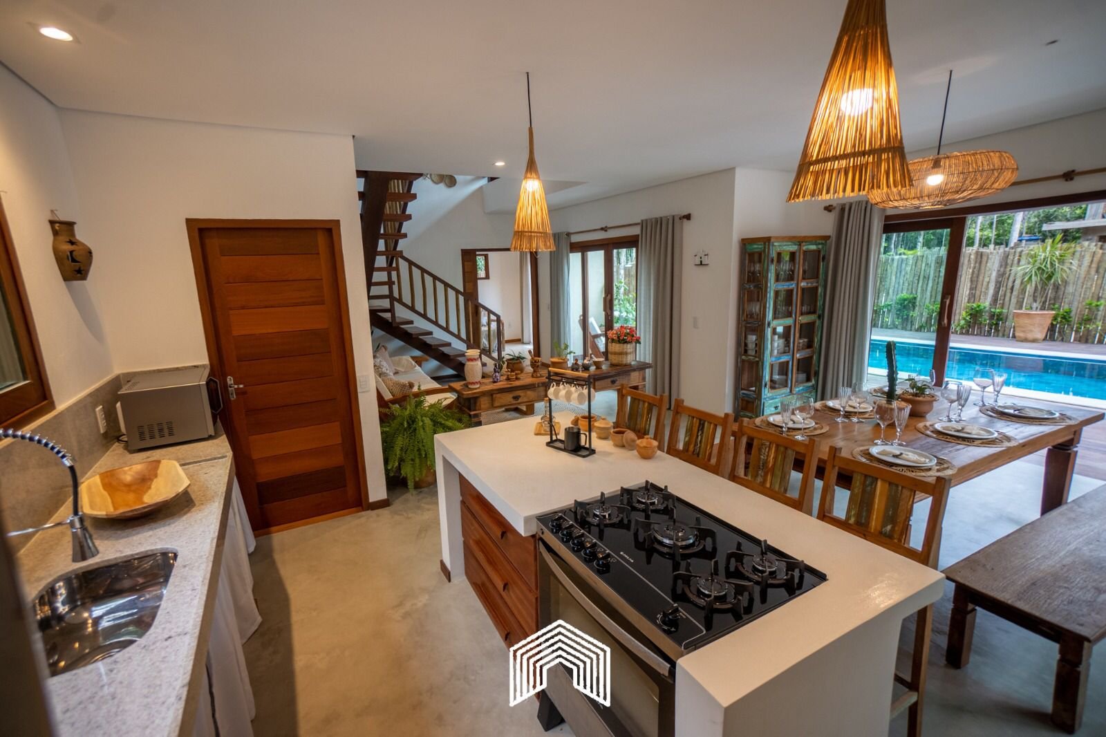Em um convite ao descanso, à contemplação e a beleza, a casa é muito bem decorada, com obras de arte local. São 03 suítes e 01 quarto, hall com cama suporte, cozinha completa, sala de estar, área gourmet externa e belíssima piscina privativa.